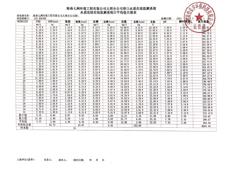 海南七洲環境工程有限公司大理分公司排口水質在線監測系統水質連續在線監測系統日平均值月報表