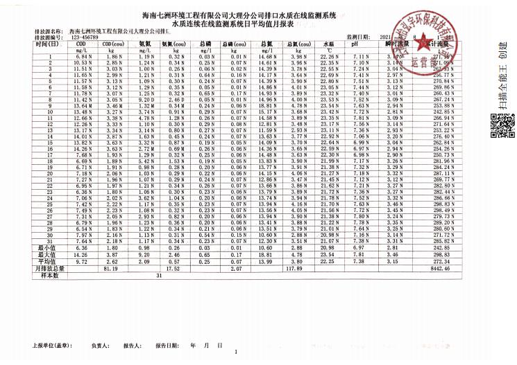海南七洲環(huán)境工程有限公司大理分公司排口水質(zhì)在線監(jiān)測系統(tǒng)水質(zhì)連續(xù)在線監(jiān)測系統(tǒng)日平均值月報(bào)表
