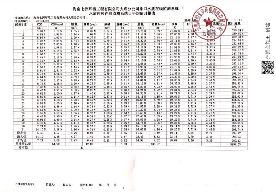 海南七洲環(huán)境工程有限公司大理分公司排口水質(zhì)在線監(jiān)測(cè)系統(tǒng)水質(zhì)連續(xù)在線監(jiān)測(cè)系統(tǒng)日平均值月報(bào)表