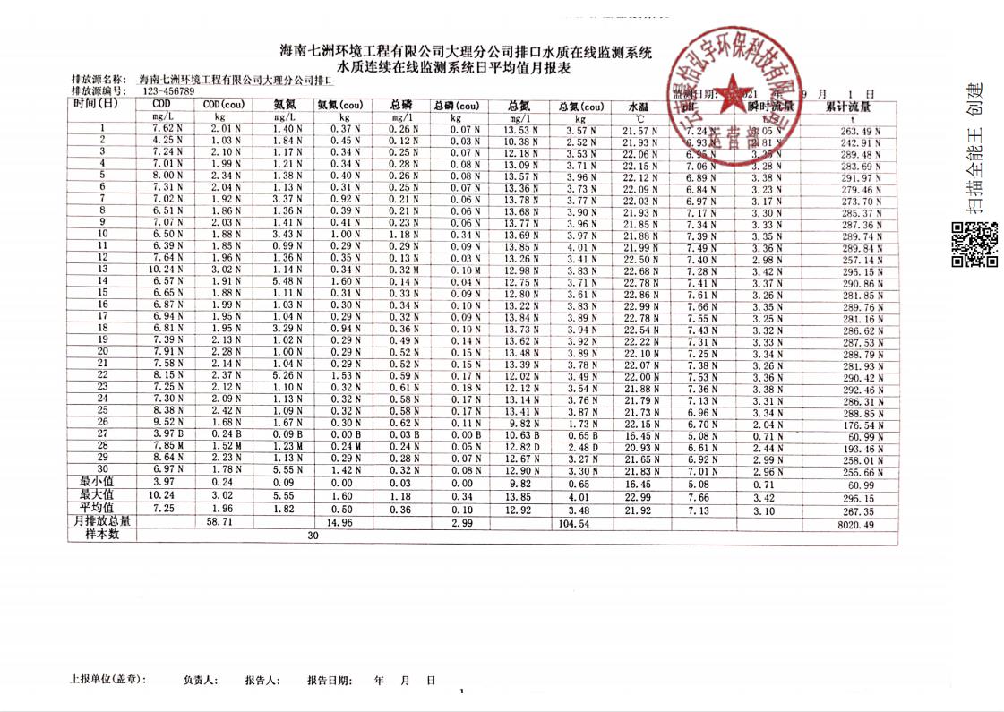 海南七洲環境工程有限公司大理分公司排口水質在線監測系統水質連續在線監測系統日平均值月報表