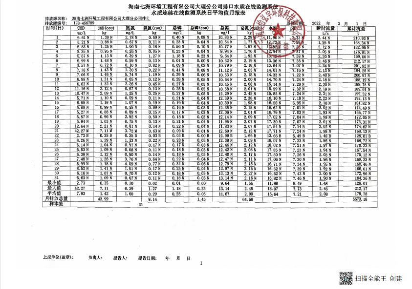 海南七洲環境工程有限公司大理分公司排口水質在線監測系統水質連續在線監測系統日平均值月報表