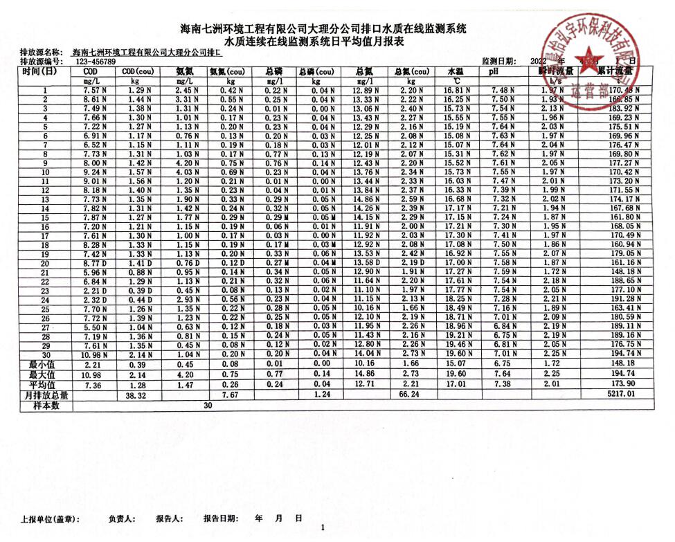 海南七洲環(huán)境工程有限公司大理分公司排口水質(zhì)在線監(jiān)測系統(tǒng)水質(zhì)連續(xù)在線監(jiān)測系統(tǒng)日平均值月報表