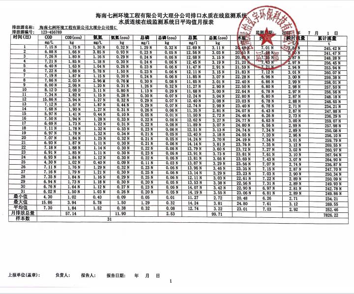 海南七洲環境工程有限公司大理分公司排口水質在線監測系統水質連續在線監測系統日平均值月報表