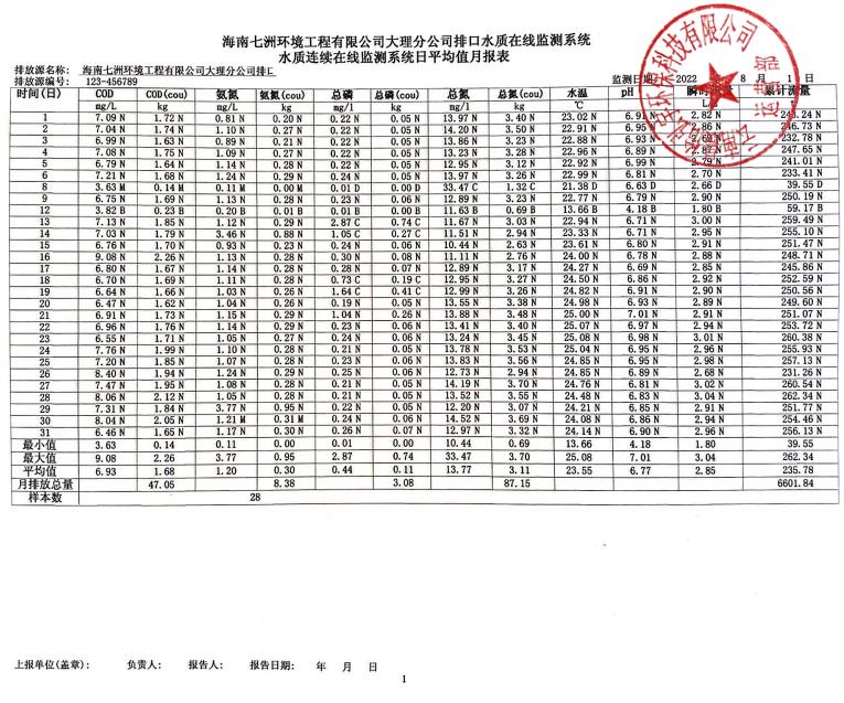 海南七洲環境工程有限公司大理分公司排口水質在線監測系統水質連續在線監測系統日平均值月報表
