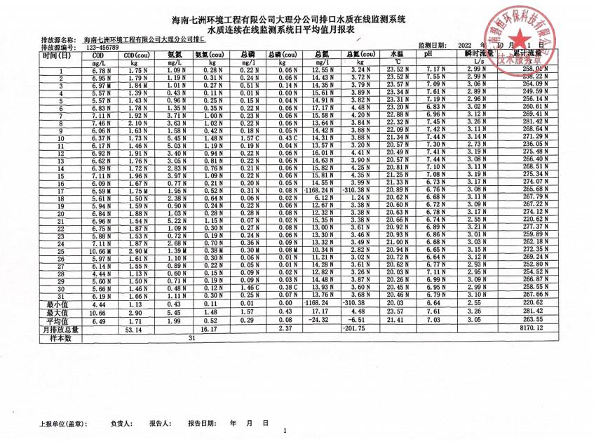 海南七洲環(huán)境工程有限公司大理分公司排口水質(zhì)在線監(jiān)測系統(tǒng)水質(zhì)連續(xù)在線監(jiān)測系統(tǒng)日平均值月報表