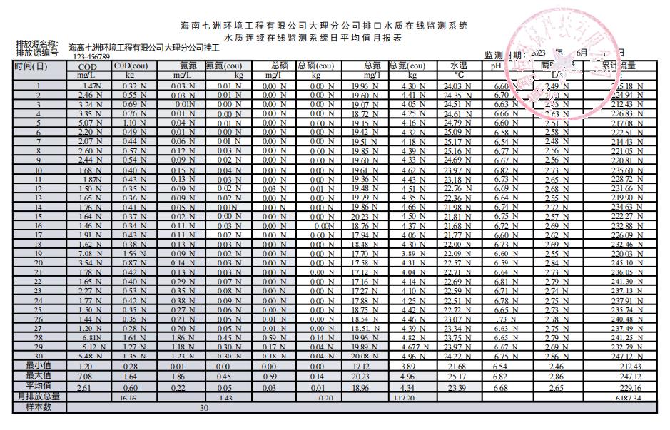 海南七洲環境工程有限公司大理分公司排口水質在線監測系統水質連續在線監測系統日平均值月報表