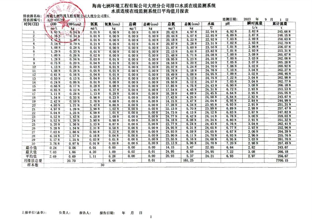 海南七洲環境工程有限公司大理分公司排口水質在線監測系統水質連續在線監測系統日平均值月報表