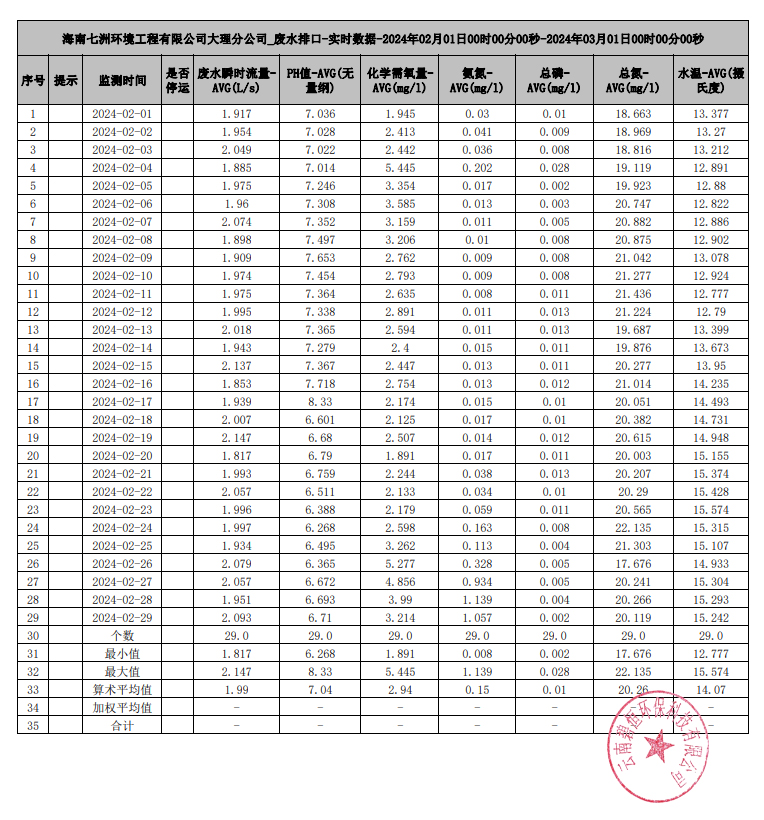 海南七洲環(huán)境工程有限公司大理分公司排口水質(zhì)在線監(jiān)測(cè)系統(tǒng)水質(zhì)連續(xù)在線監(jiān)測(cè)系統(tǒng)日平均值月報(bào)表