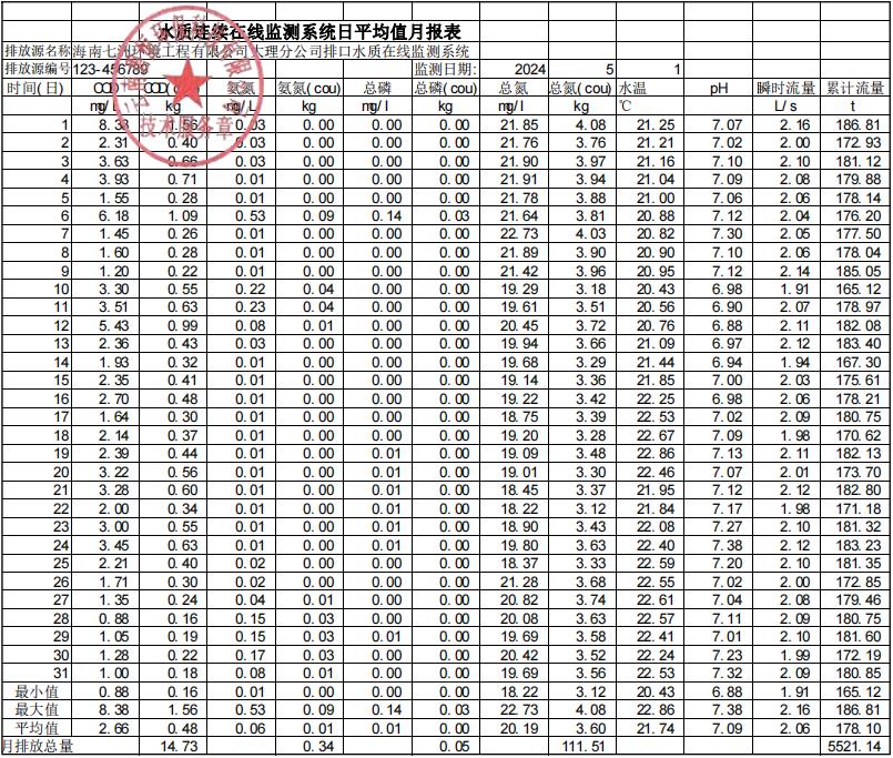 海南七洲環境工程有限公司大理分公司排口水質在線監測系統水質連續在線監測系統日平均值月報表