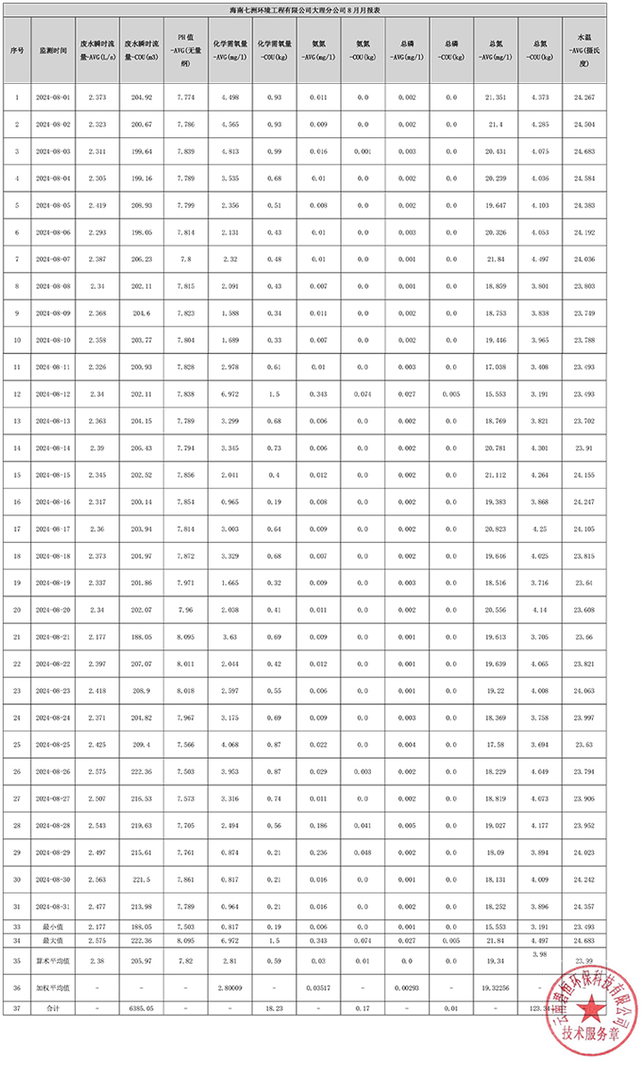 海南七洲環境工程有限公司大理分公司2024年8月月報